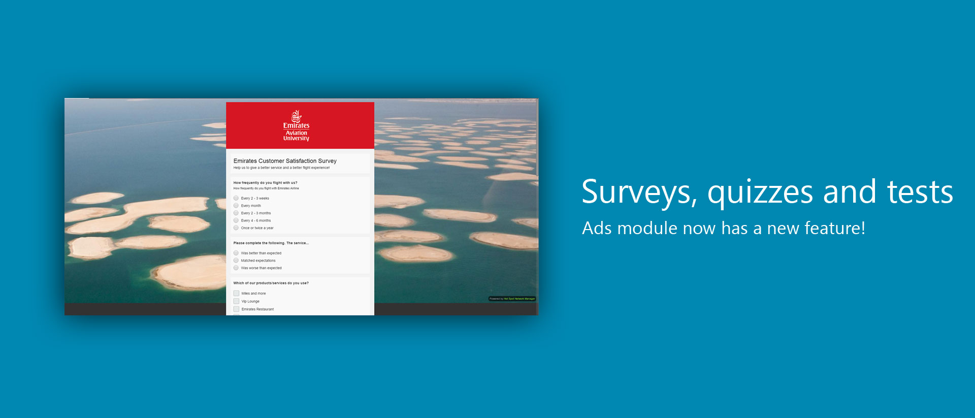 Το module των διαφημίσεων έχει πλέον ένα νέο Χαρακτηριστικό! Δημιουργήστε πανεύκολα ερωτηματολόγια, Quiz και ψηφοφορίες.Δημιουργήστε τα ερωτηματολόγια σας μέσω ενός πολύ φιλικού προς το χρήστη περιβάλλοντος εργασίας (User Interface). Επιλέξτε μεταξύ πολλαπλών τύπων ερωτήσεων, προσαρμοζόμενα και παραμετροποιήσιμα θέματα και ευέλικτες επιλογές. Μπορείτε να χρησιμοποιήσετε αυτές τις δυνατότητες για να δημιουργήσετε με βάση τις ανάγκες σας τα ερωτηματολόγια σας τα quiz και τις δημοσκοπήσεις σας στα μέτρα σας!